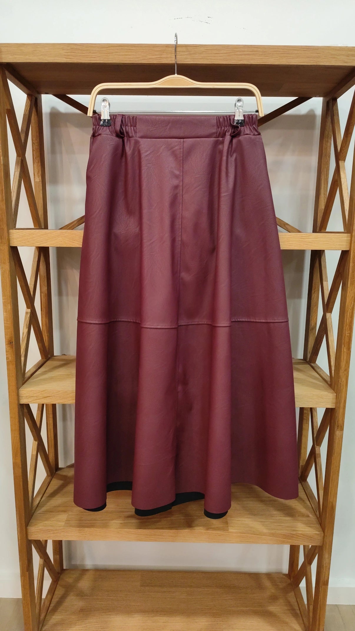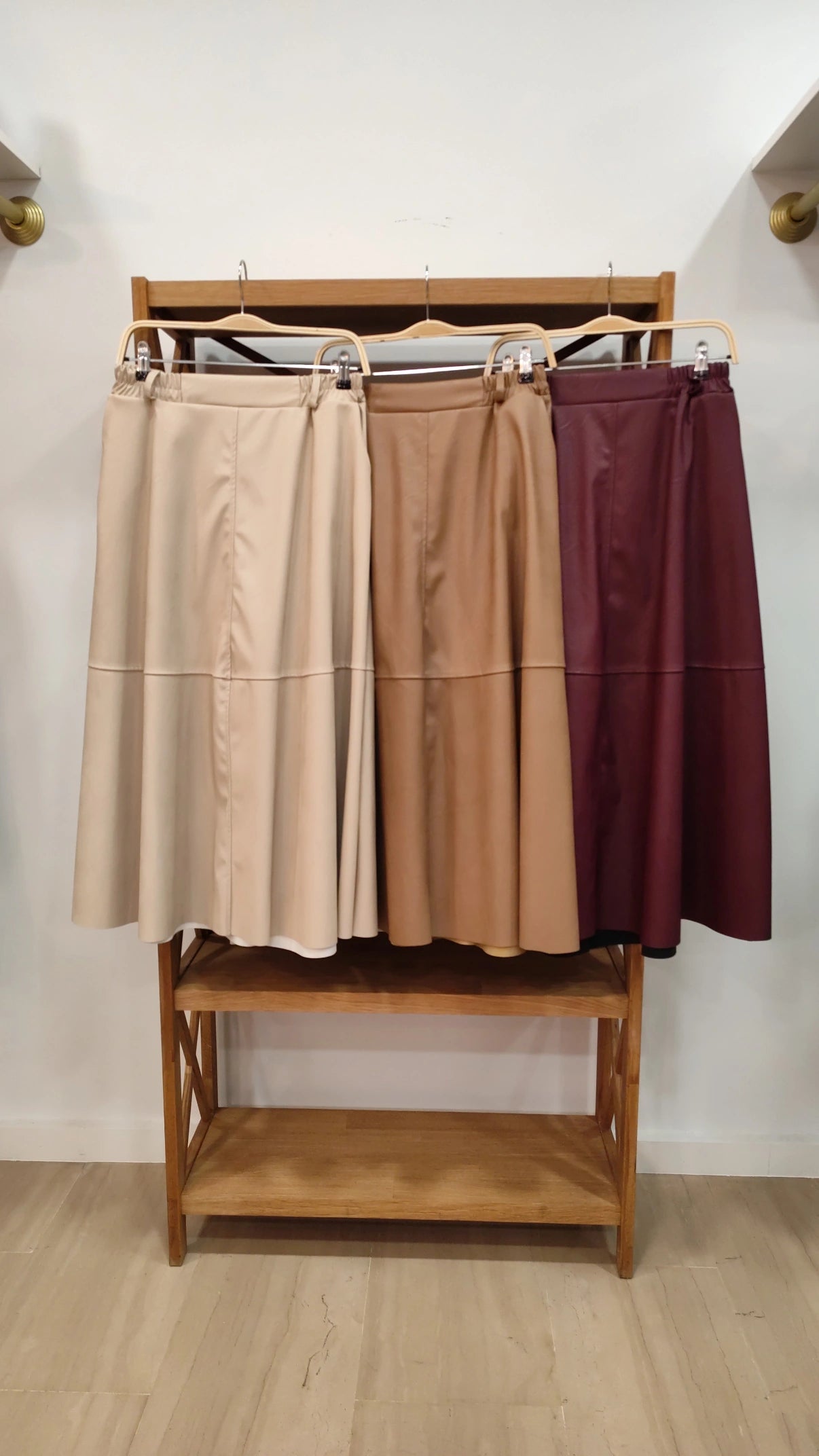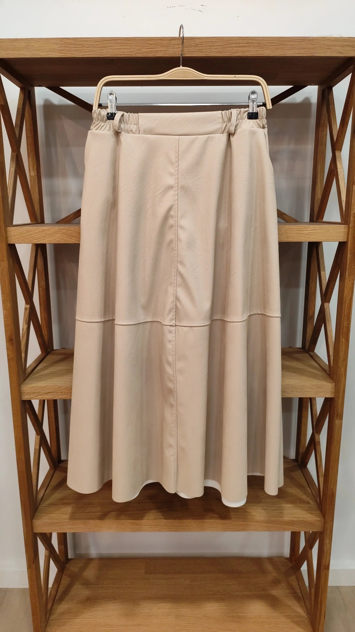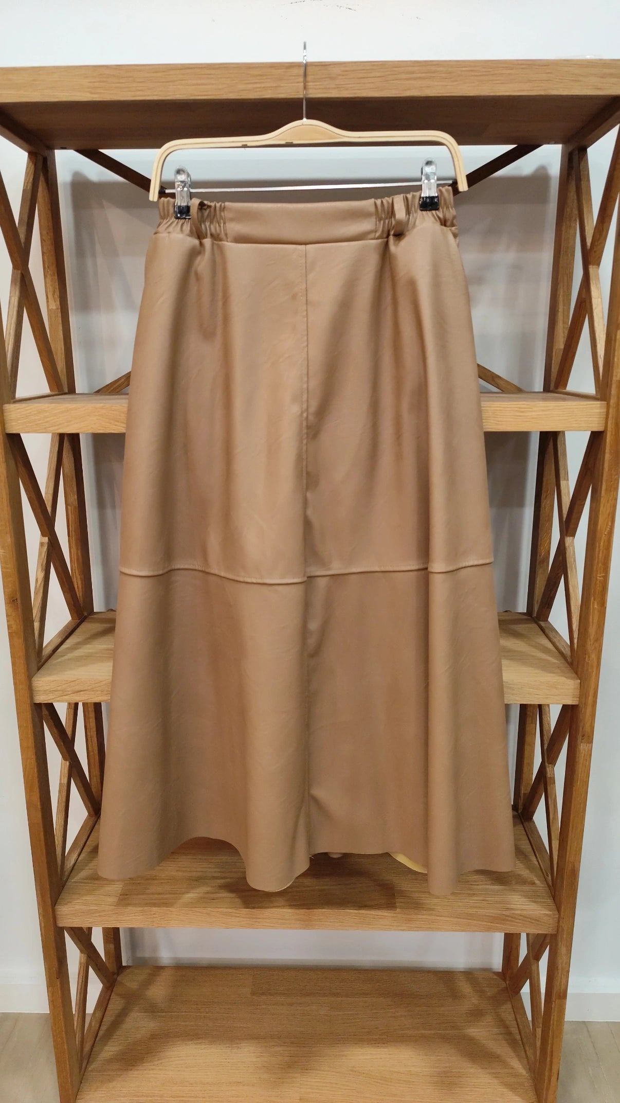 - Falda efecto piel con goma en la cintura y bolsillos.