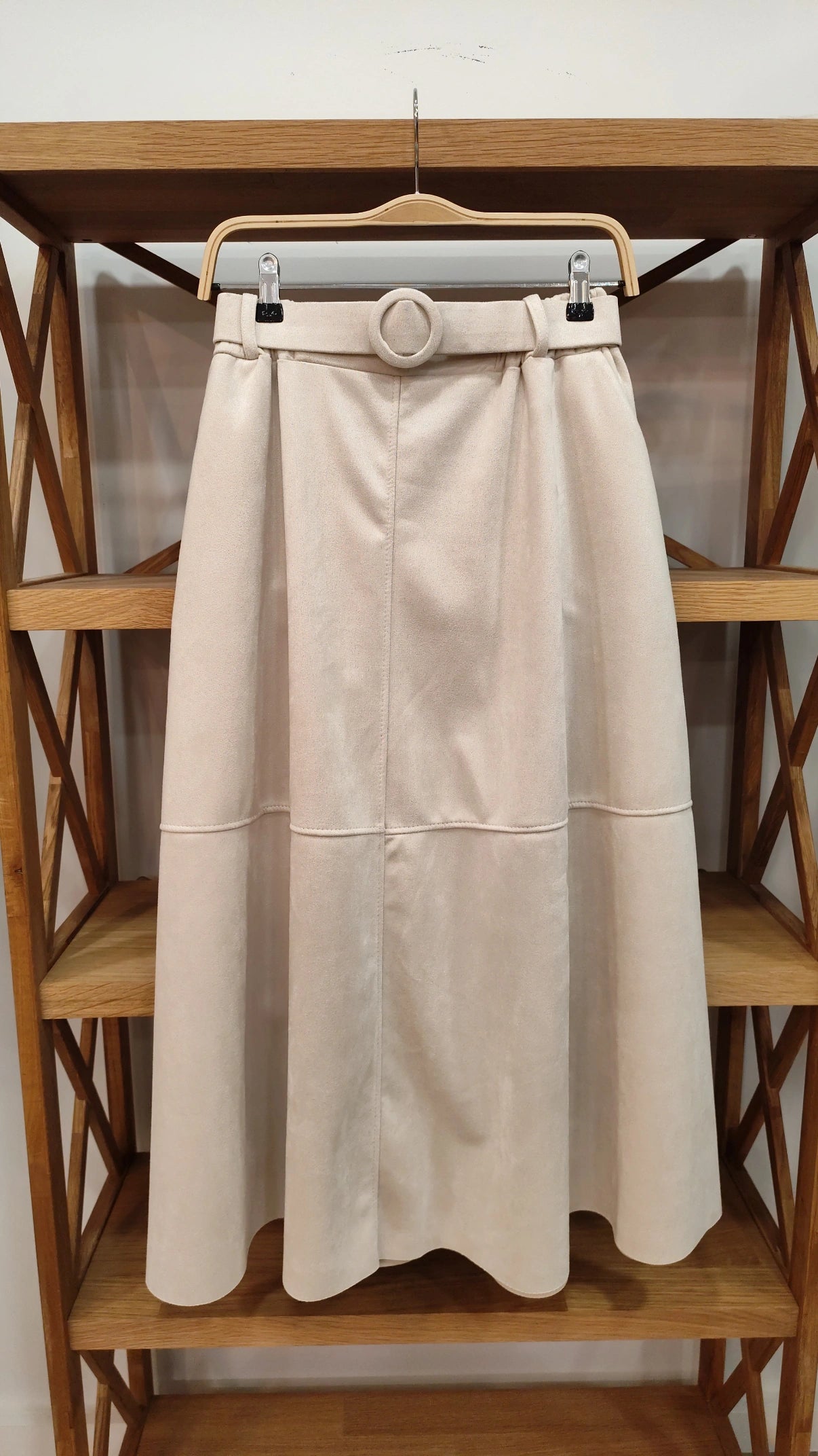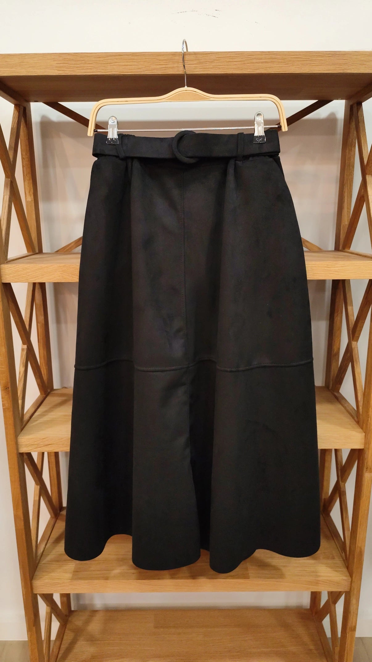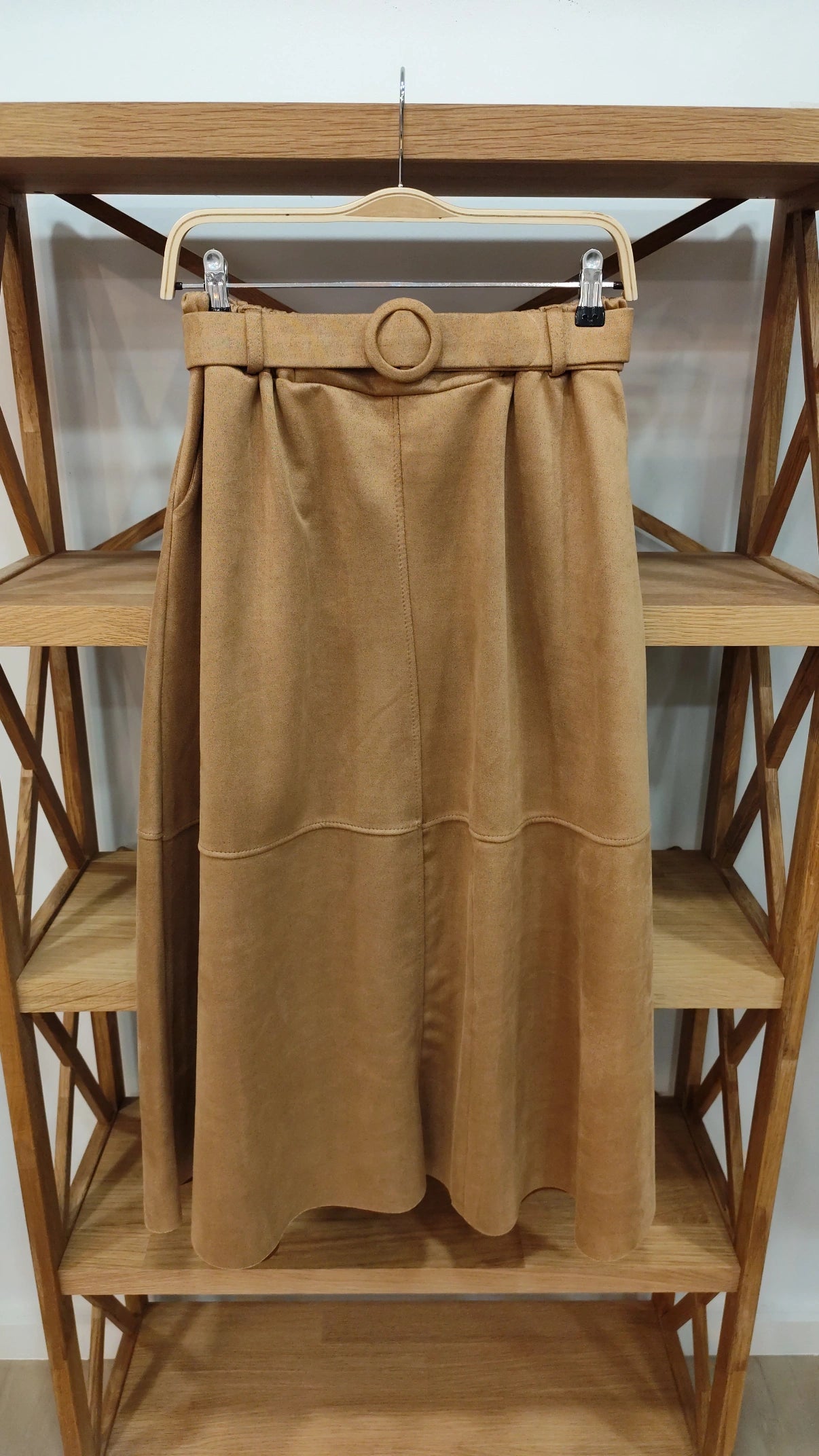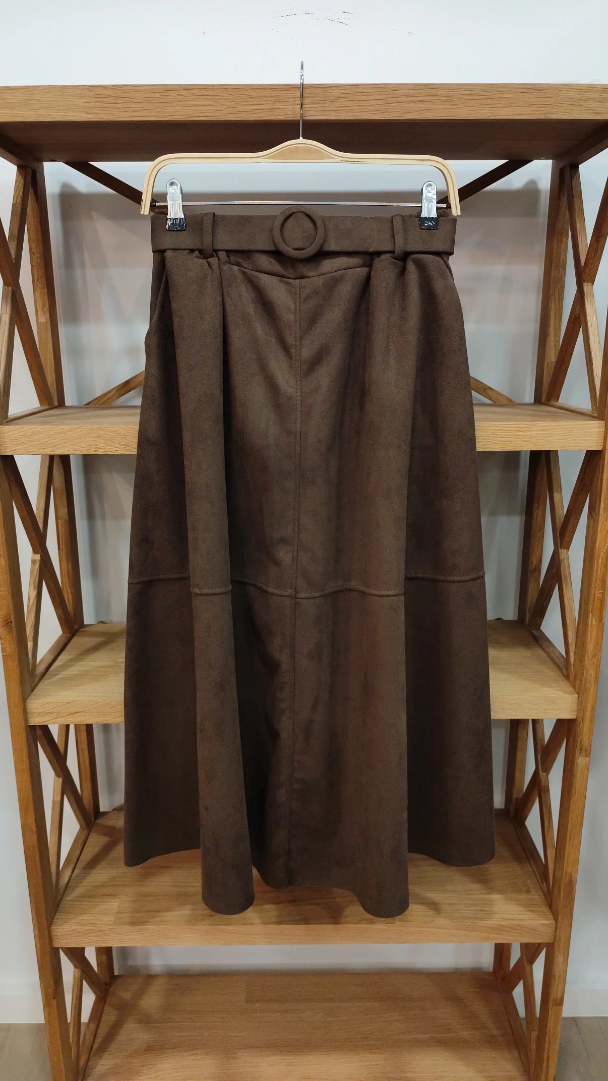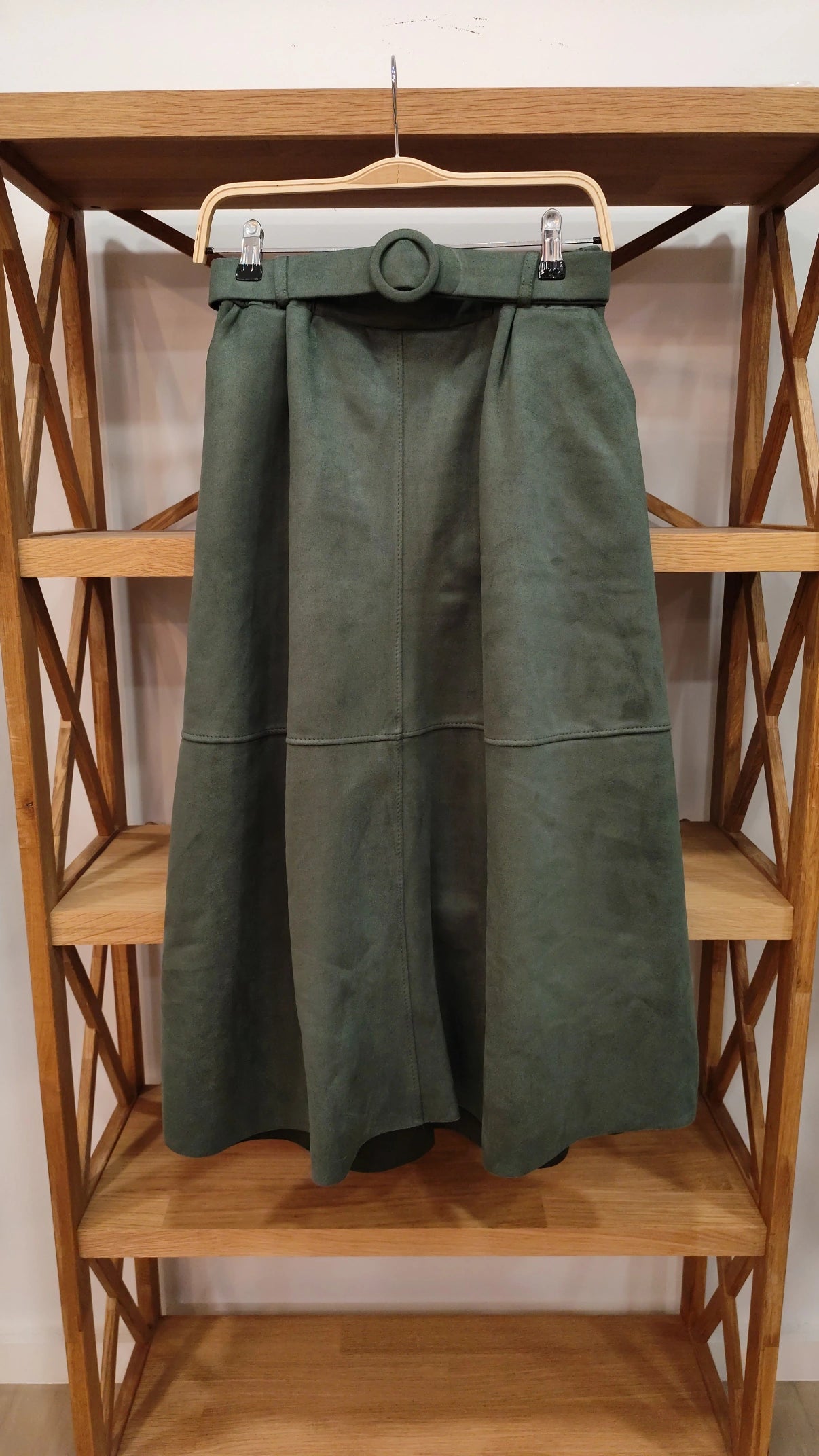 - Falda efecto antelina corte de capa, con cinturón y bolsillos.