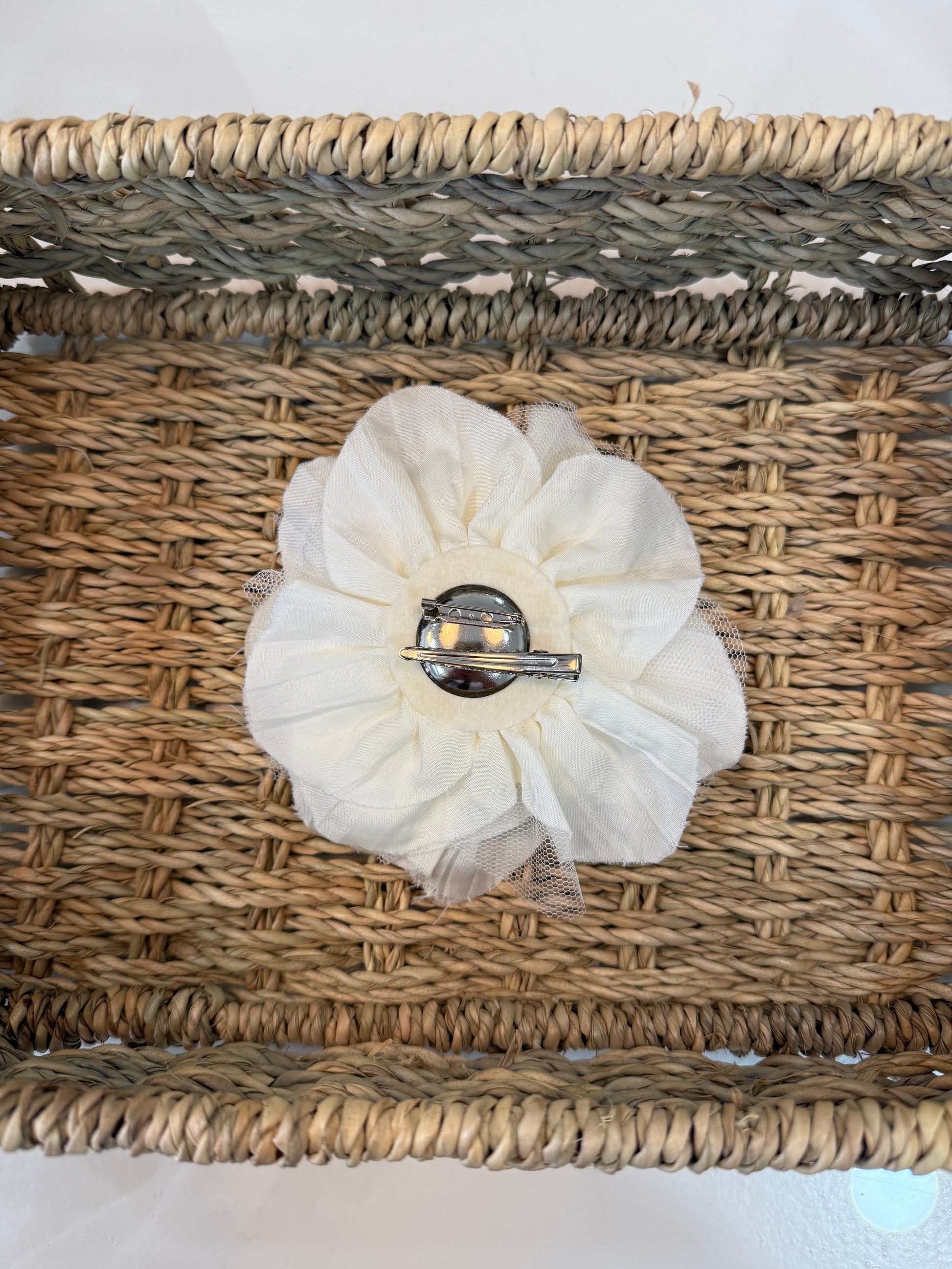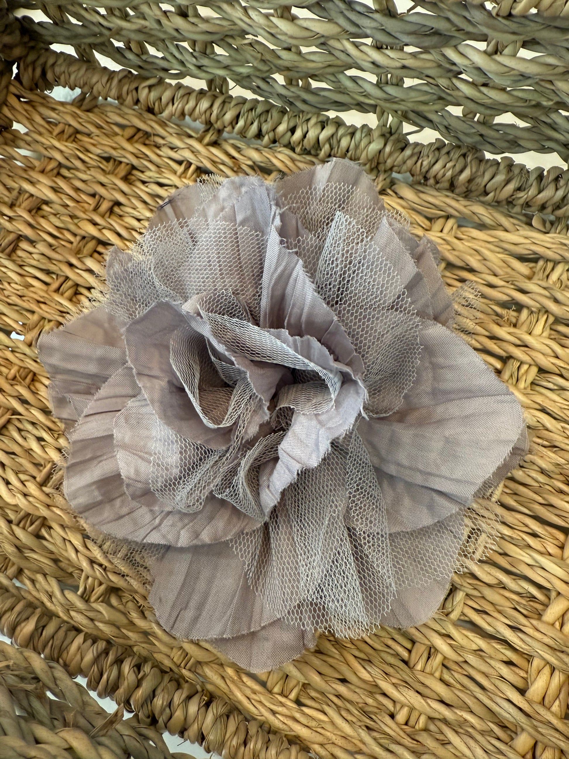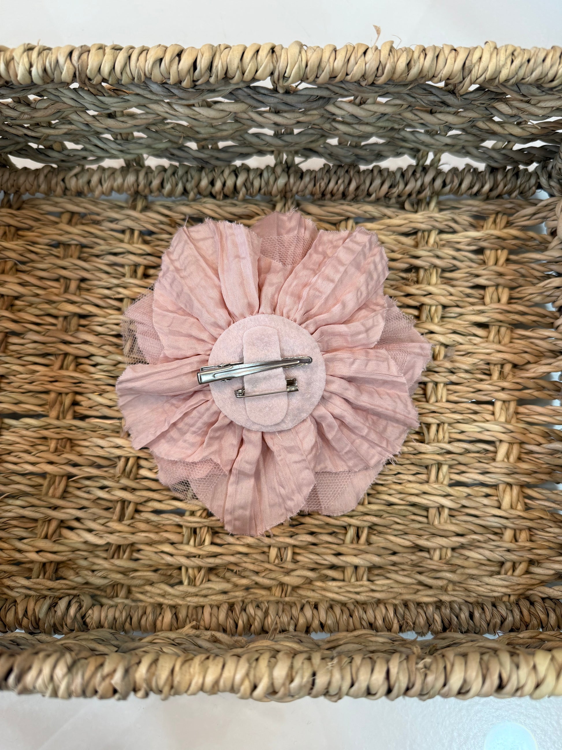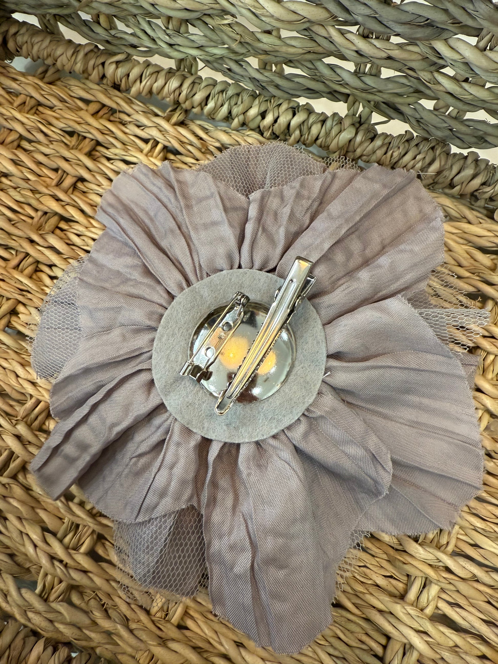 - Flor de tela y tul, con pinza e imperdible.