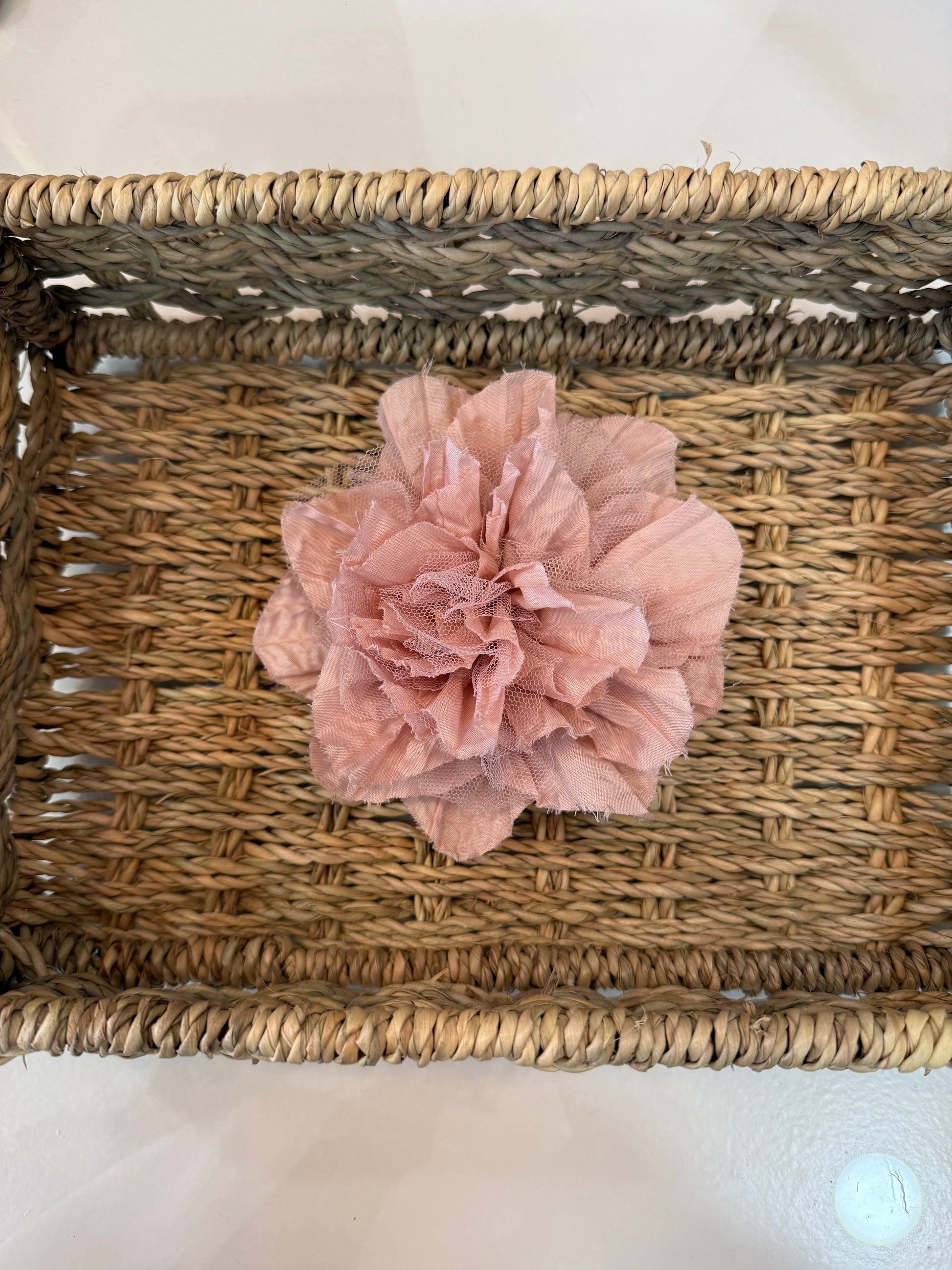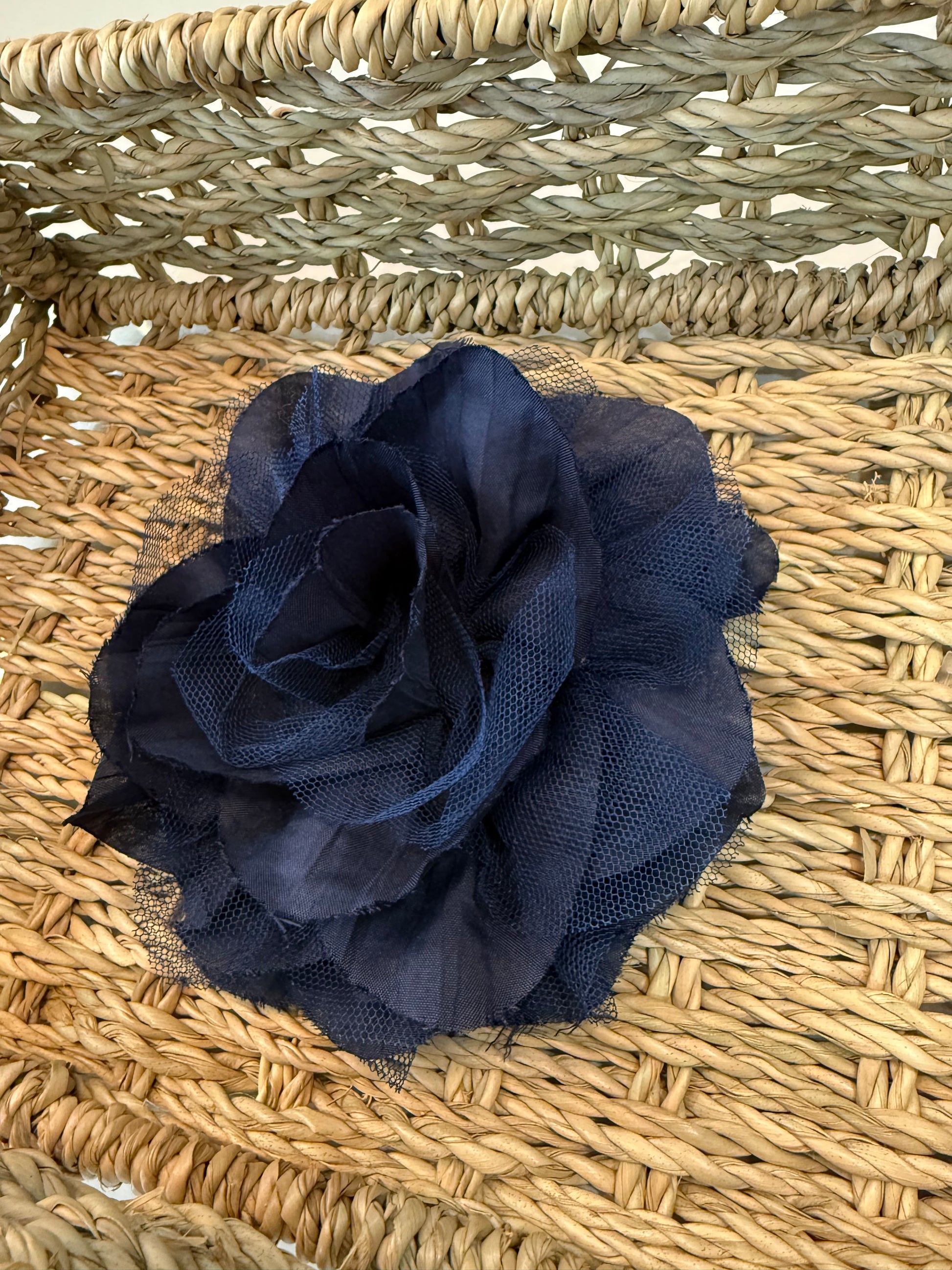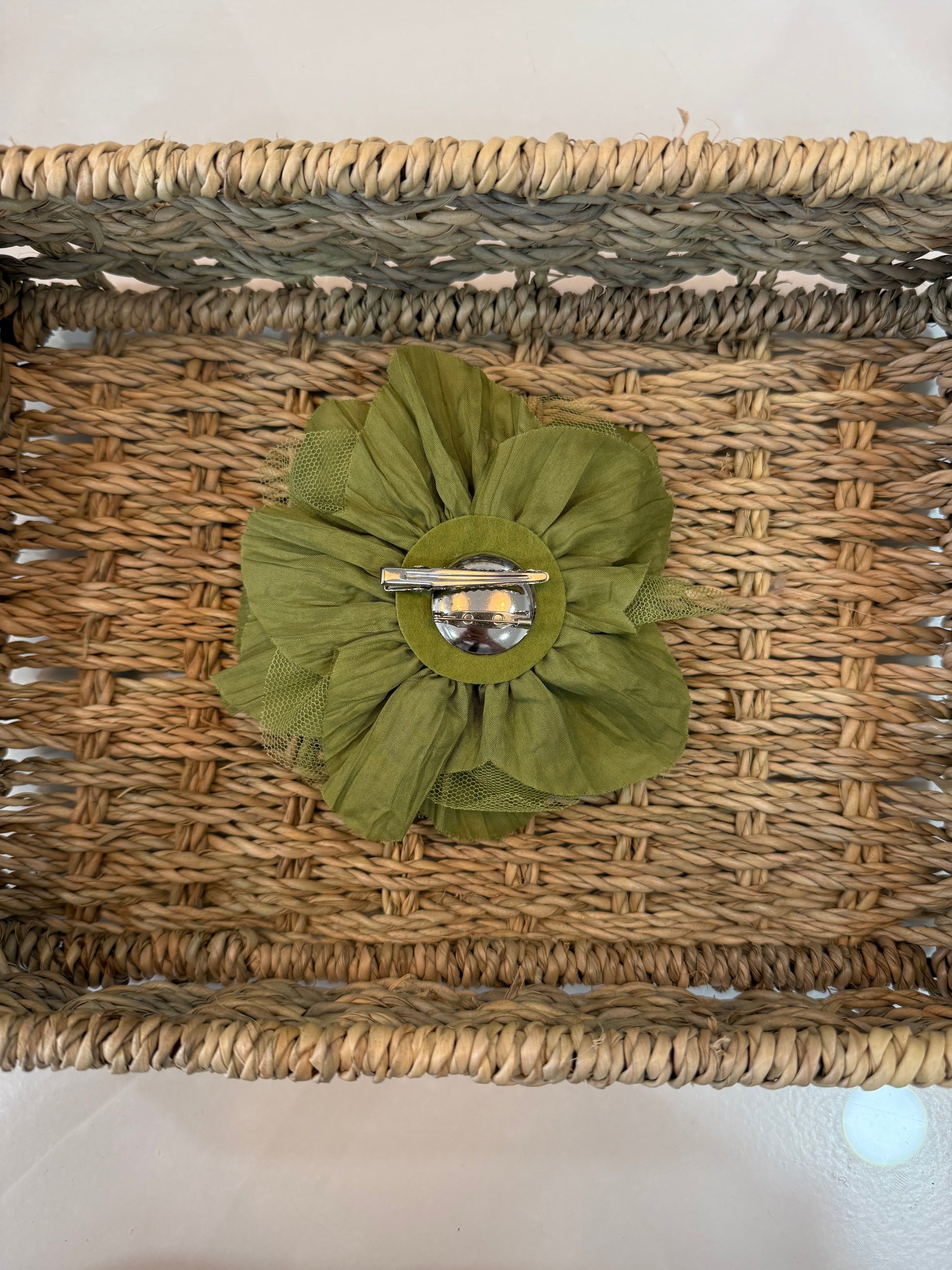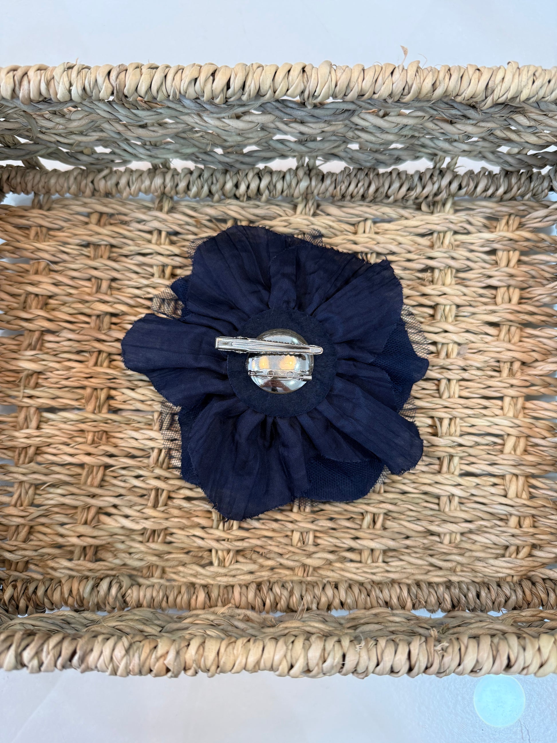 - Flor de tela y tul, con pinza e imperdible.