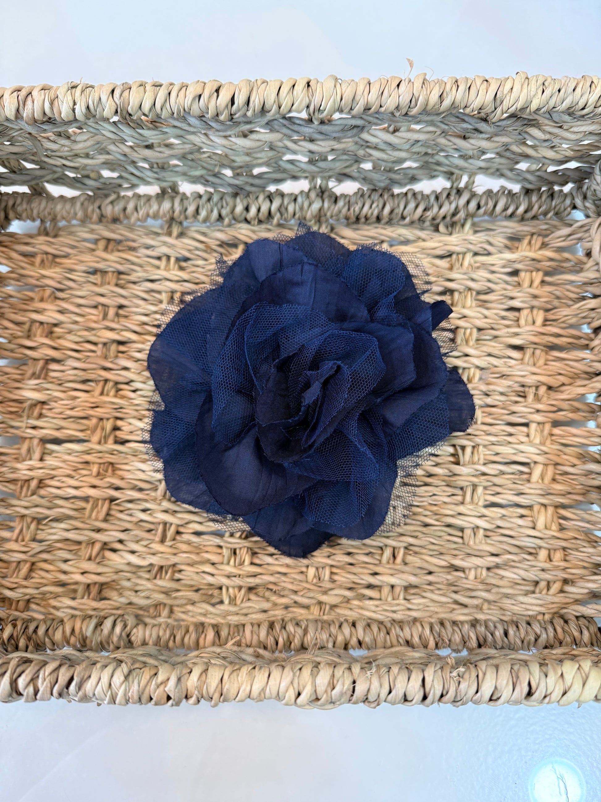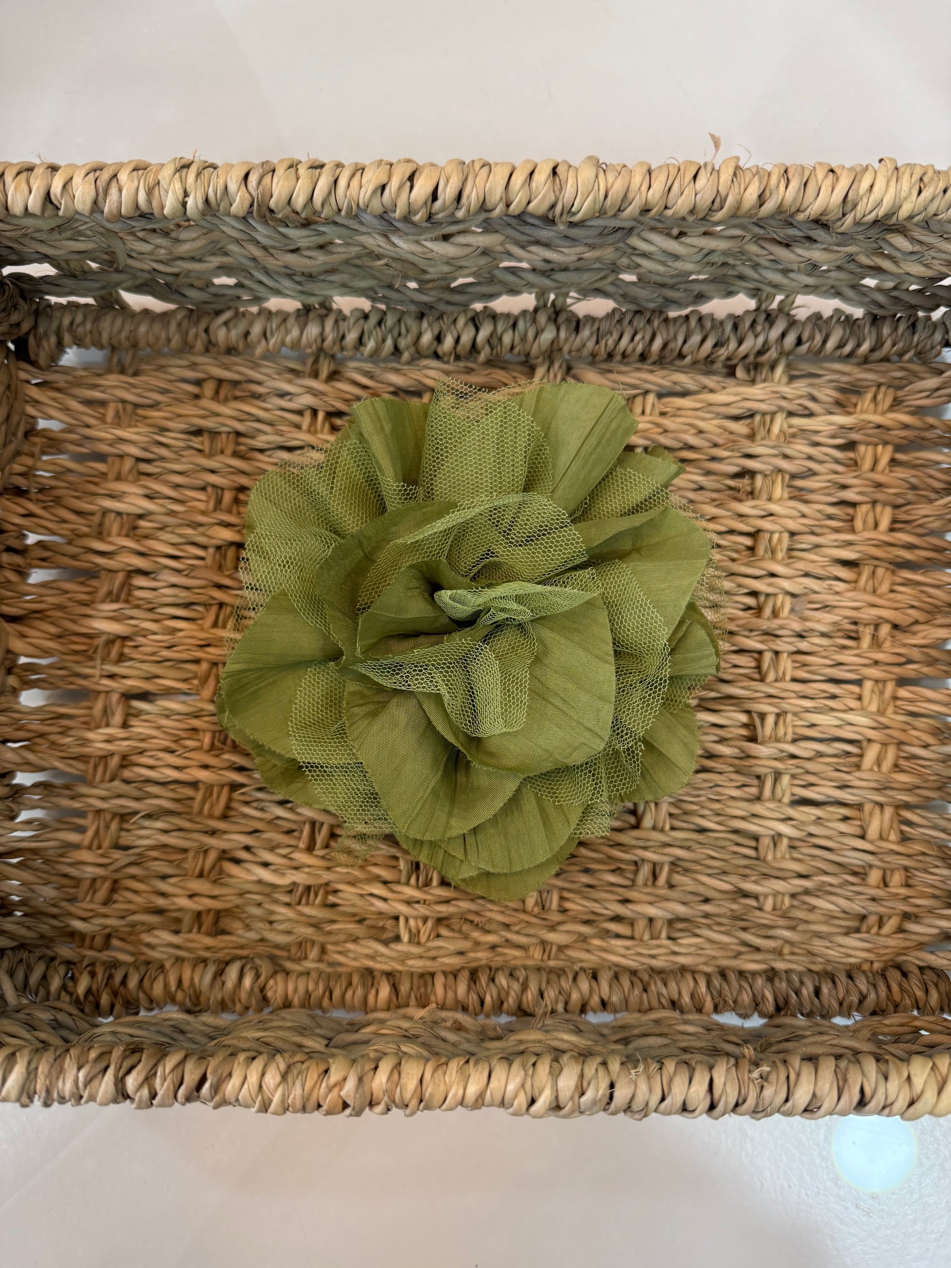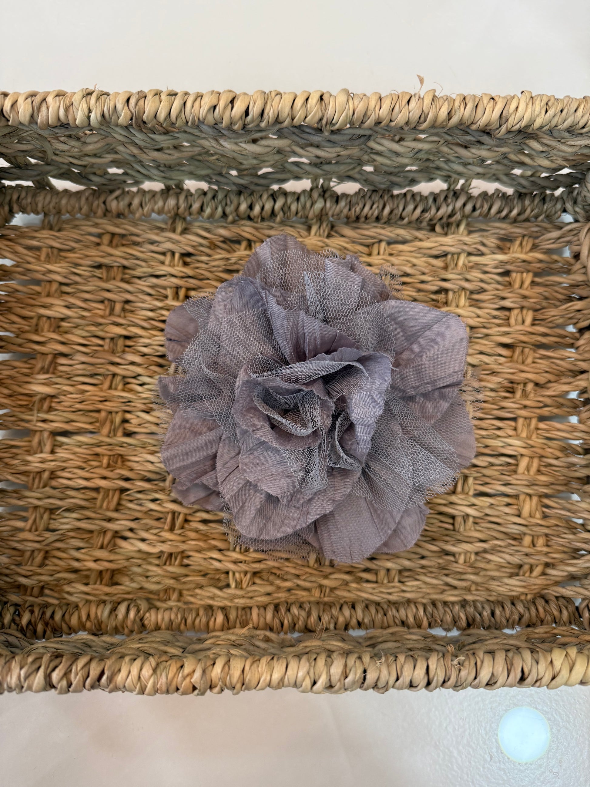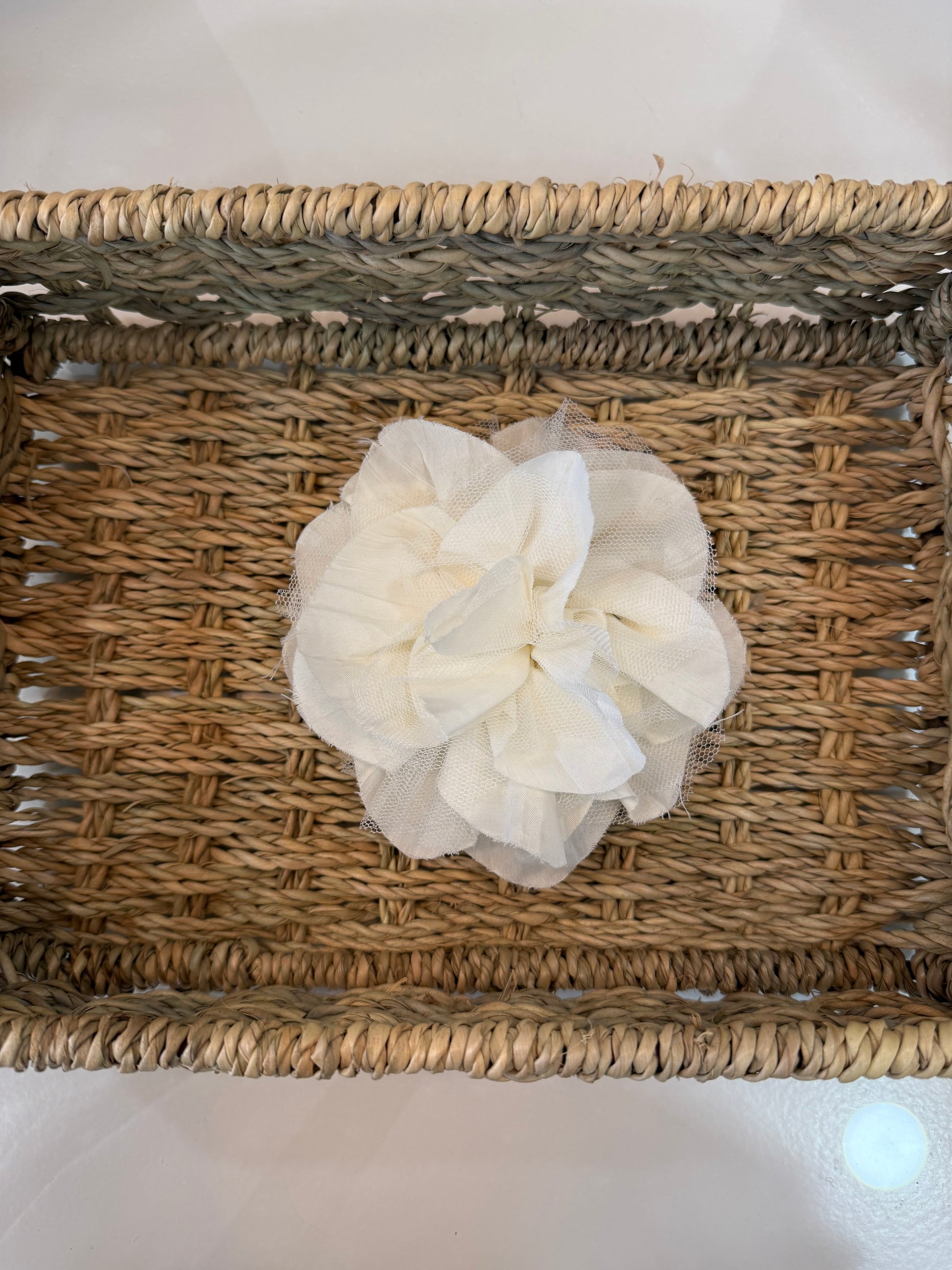 - Flor de tela y tul, con pinza e imperdible.