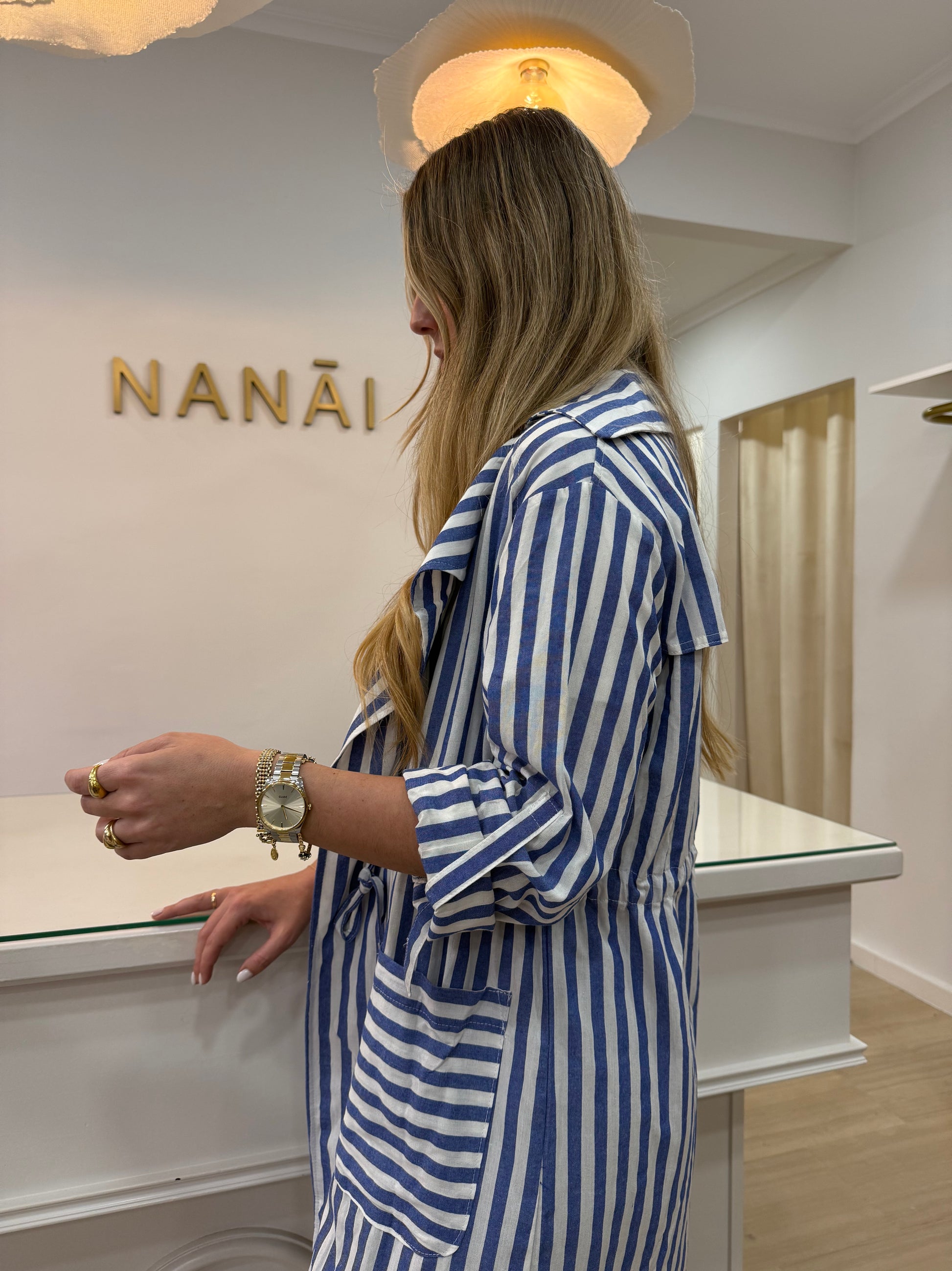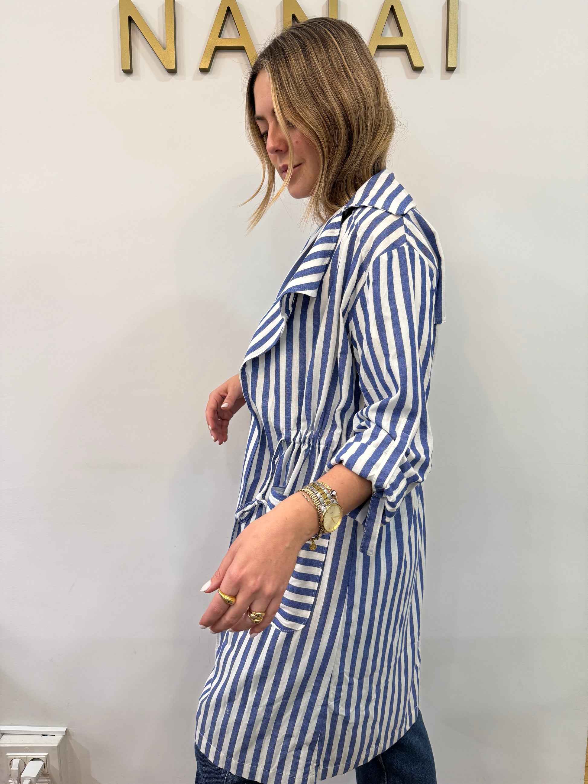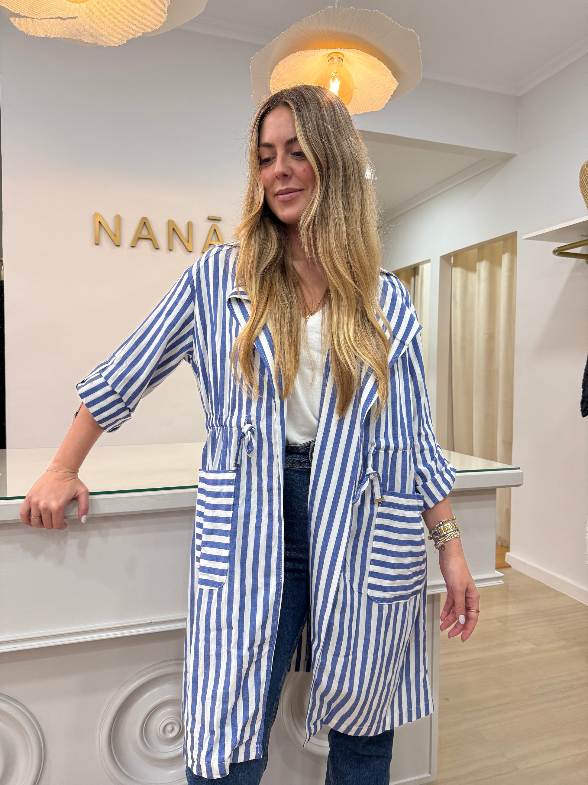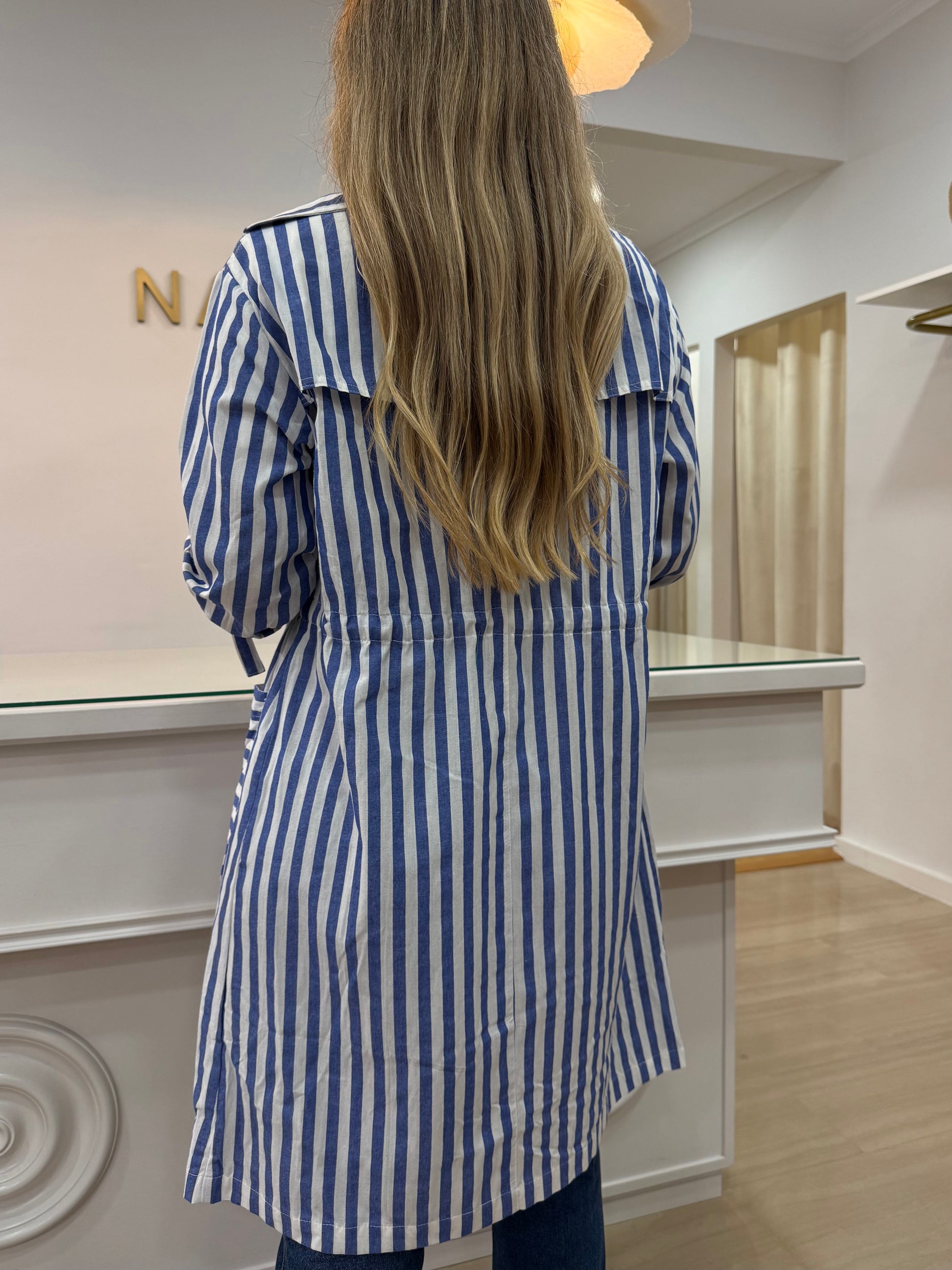 - Gabardina de rayas azul y blanca.