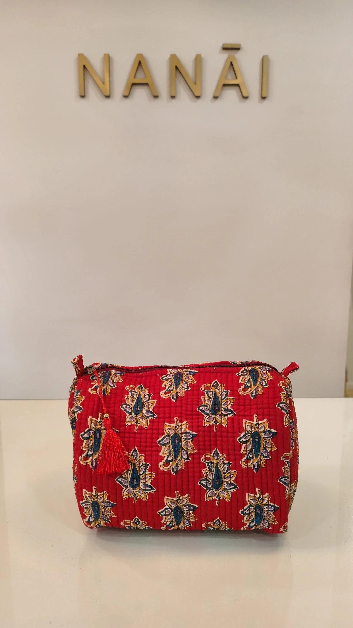 • Neceser de algodón acolchado con forro y bolsillos interiores.