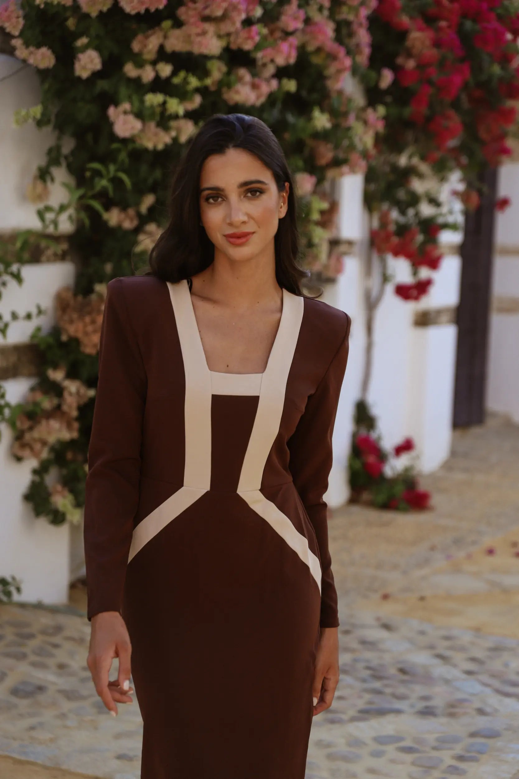 - Vestido midi entallado con escote caja, mangas largas y espalda cerrada. Presenta cortes en contraste que estilizan la figura.