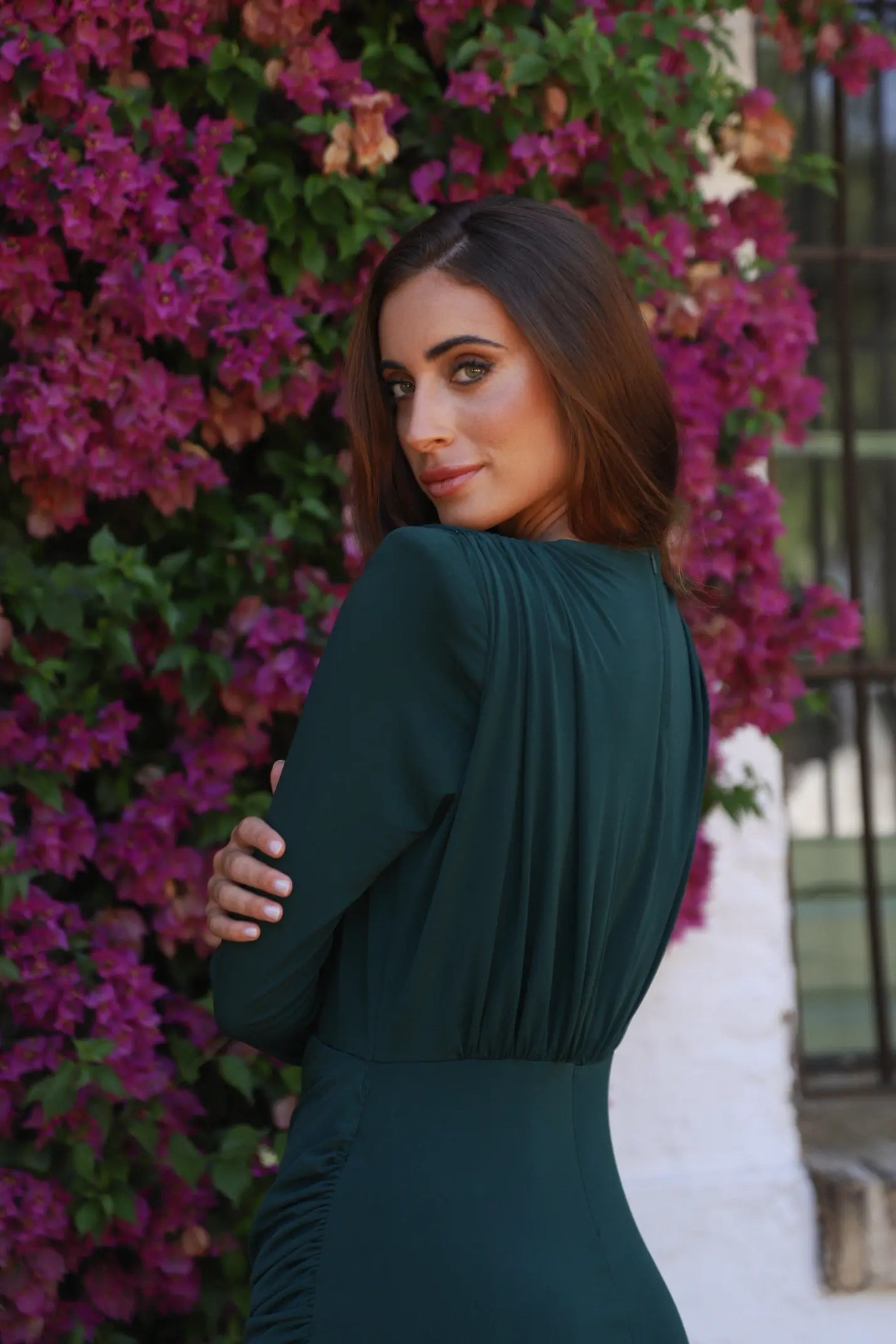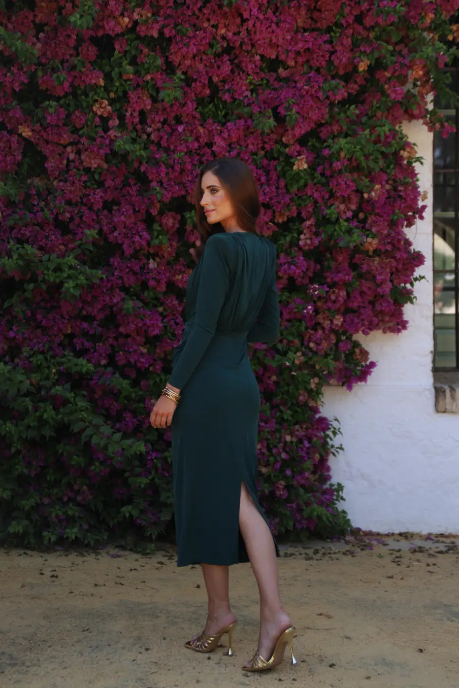 - Un vestido midi con escote en pico y mangas largas que combina sensualidad y elegancia contemporánea.